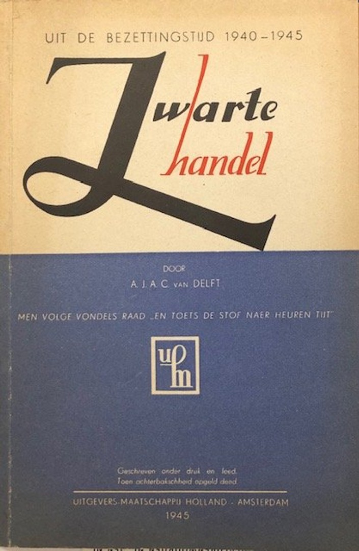1945, 67 pp, paperback, in redelijke staat, vergeeld, wat sleets en broos [Auteur: DELFT, A.J.A.C. van] [Pagina's: 67] [Taal: nl] [Uitgever: Uitgevers-Maatschappij Holland, Amsterdam] [Jaar: 1945] [Titel: Uit de bezettingstijd 1940-1945: Zwarte handel]