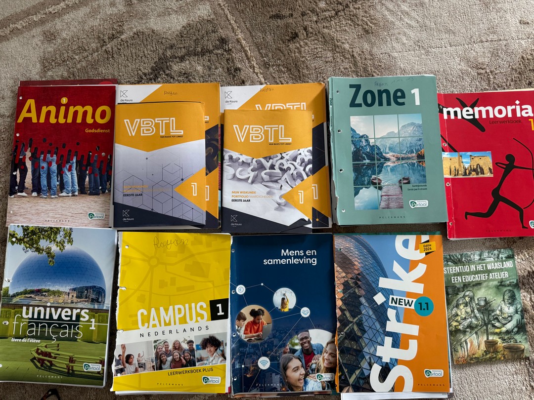 Hier vind je schoolboeken voor het eerste middelbaar. Ze zijn slechts 1 maand gebruikt. De eerste pagina’s zijn verwijderd op vraag van de school, maar de boeken zijn verder helemaal compleet en in uitstekende staat.